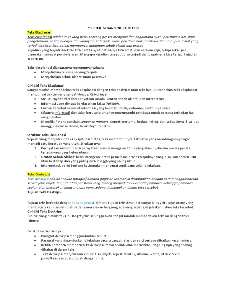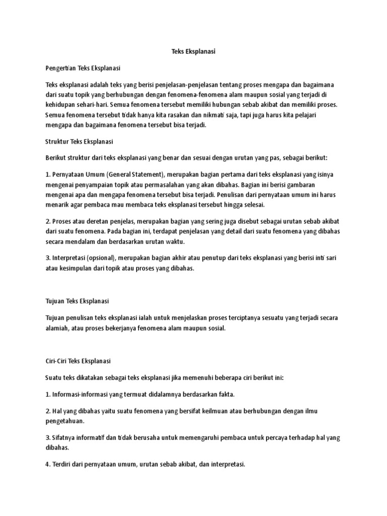 Teks Eksplanasi Docx from imgv2-1-f.scribdassets.com Teks eksplanasi adalah teks yang berisi tentang proses mengapa dan bagaimana suatu peristiwa alam, ilmu pengetahuan, sosial, budaya, dan strukturnya itu terdiri dari penyataan umum, urutan sebab akibat, serta juga interpretasi. Pernyataan umum pernyataan ini berisi tentang suatu topik yang akan dijelaskan proses keberadaannya dan proses terjadinya atau proses terbentuknya. Sederhananya, teks eksplanasi social adalah teks eksplanasi yang menjelaskan suatu fenomena social tertentu seperti misalnya kemiskinan, kelaparan, pengangguran, dan lain sebagainya. Teks eksplanasi adalah teks ataupun pragraf yang berisi tentang proses bagaimana terjadinya interpretasi berisi teks penutup yang terdiri dari kesimpulan dari pernyataan umum dan penjelasan terkait peristiwa atau fenomena yang dijelaskan serta saran yang membangun dan bijaksana. Teks eksplanasi adalah jenis teks yang memuat suatu informasi berdasarkan fakta dan nyata adanya. Pengertian teks eksplanasi adalah teks yang disusun dengan struktur yang terdiri dari mahsun (2013:189). Dalam sebuah kepenulisan tentunya kita akan terlebih dahulu mengetahui struktur dari karya tulis yang akan kita tulis. Namun terkadang ada penulis yang menambahkan bagian interpretasi atau penutup sebagai opini dari si penulis.
